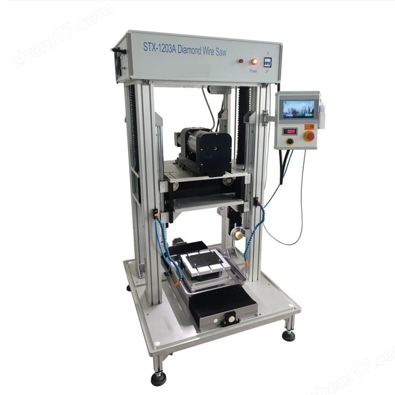 1、主电机带动金刚石切割线向下做定速移动,材料固定在工作台上不动,确保切割的稳定。
